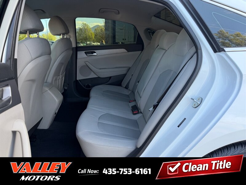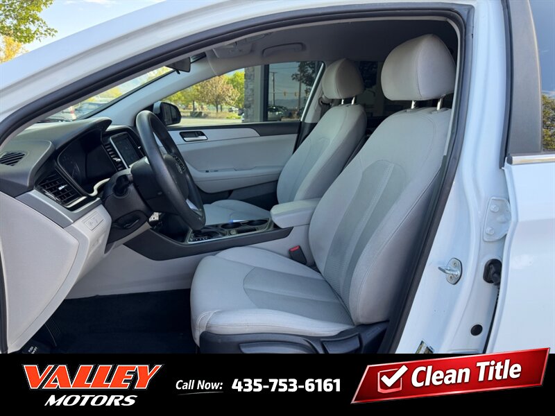 2019 Hyundai Sonata SE — Quartz White Pearl exterior, Beige interior. This sedan is powered by the factory Theta II 2.4L I4 SULEV engine (185 hp / 178 lb-ft) and delivers an EPA-estimated 26 MPG city and 35 MPG highway. It has under 70,000 miles (averaging less than 9,000 miles per year), is in excellent overall condition, and comes with a clean CARFAX.